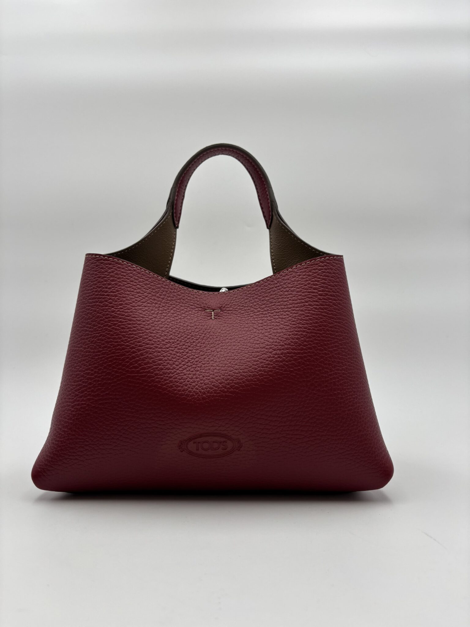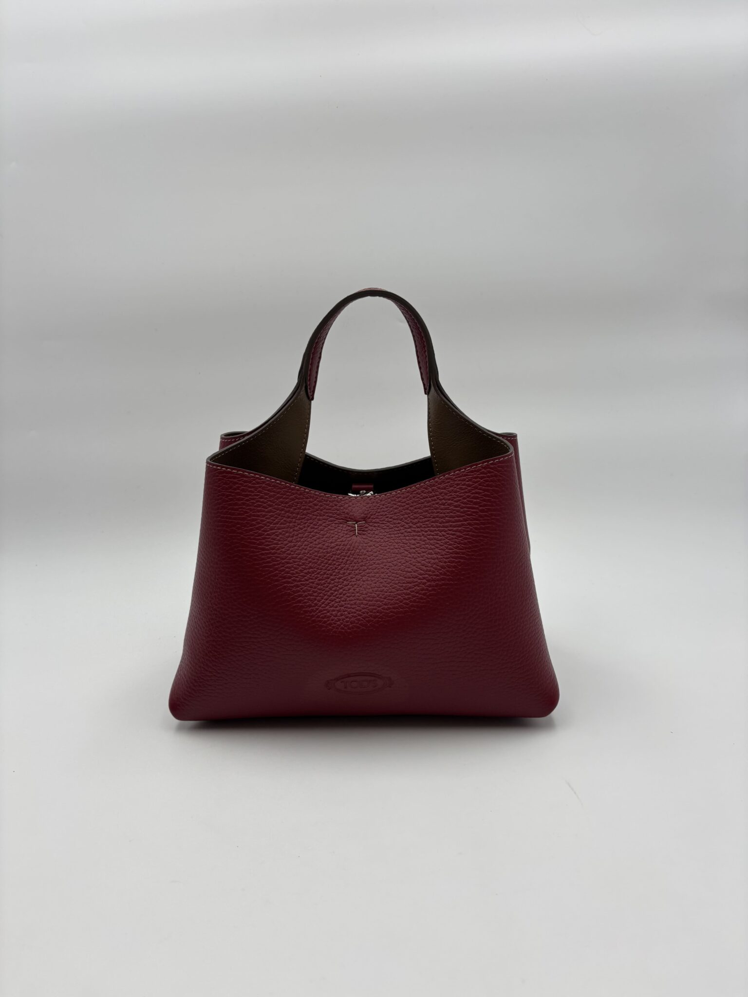 Sac en cuir souple grainé, avec logo Tod’s imprimé sur le devant, anse plate et bandoulière amovible. L’intérieur possède deux compartiments séparés par une poche centrale zippée. Une élégante création orné des fameux détails iconiques comme le pendant T Timeless en métal griffé et la couture en T.
